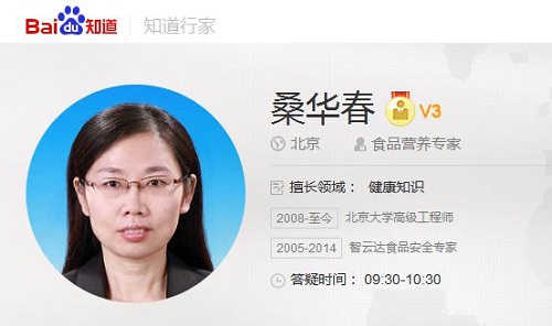 同時,北京智云達科技有限公司董事長——桑華春老師從2013年起一直在百度知道上為有食安疑惑的人解答食品安全的相關問題,共幫助140余萬人,優質回答數1900余條,目前是食品營養方面的知道行家。