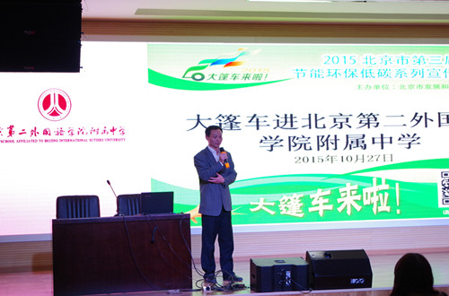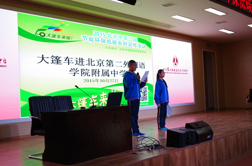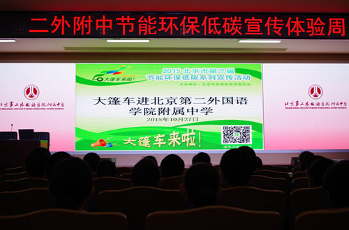 由北京市發(fā)展改革委員會(huì)主辦的2015北京市第三屆節(jié)能環(huán)保低碳系列宣傳活動(dòng)“低碳大篷車”于2015年10月27日走進(jìn)北京第二外國(guó)語學(xué)院附屬中學(xué)。