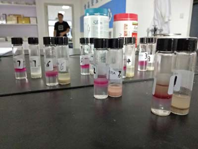 顯色劑的準備之后,取八份樣品,取一支試劑A,將所取樣品加入管中,蓋緊蓋子,充分震蕩混勻,靜置幾分鐘,使上層液澄清;然后用0.5mL吸管吸取試劑A瓶中上層溶液約一半的量至試劑B瓶中;蓋緊B蓋塞子,上下翻轉(zhuǎn),使其混合,靜置至清晰分層;另取一支0.5mL 吸管,吸取試劑C至吸管細部前端約1/4 處,插入至試劑B瓶的下層溶液中并緩慢排空,觀察B瓶下層溶液中是否產(chǎn)生渾濁絮狀物或沉淀物。