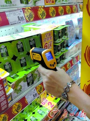 5日中午12時,在芳村的好又多超市,立式冷柜都帶有透明的塑料簾以防溫度上升,但在其他的臥式冰柜,卻有5個柜門大開,里面擺放的酸牛奶絲毫無涼意。記者用紅外測溫儀檢測,發(fā)現(xiàn)最上方的一組酸奶,包裝溫度已經(jīng)達(dá)到了24.2℃。促銷員告訴記者,該品牌的酸奶是暫時放在臥式冰凍柜里用于周轉(zhuǎn)的,“上面一層不怎么冰,下面都是冰的。”不過記者檢測發(fā)現(xiàn),即使最下層的牛奶溫度也是8.7℃。