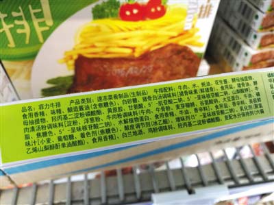 盡管“重組肉”并不違規(guī),但新京報(bào)記者近日走訪北京華聯(lián)、沃爾瑪?shù)瘸邪l(fā)現(xiàn),不少牛排添加了卡拉膠等食品添加劑,卻以“原切牛排”的名義出售。