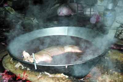 在查獲現(xiàn)場,記者看到違法人員臨時搭建的私宰帳篷里,地上鋪滿了豬血和豬毛的混合物,生豬糞便隨著水流漸漸形成一條“小河”流向遠處,殺豬刀、鐵鉤、鐵叉等用于私宰的工具隨意擺放在地上,與豬毛、豬血、糞便等混合在一起,現(xiàn)場一口直徑近2米的大鍋盛滿了水,熱氣騰騰。深圳市市場稽查局食品稽查處的執(zhí)法人員告訴記者,這口大鍋是用來給生豬褪毛的,隨后就在骯臟的環(huán)境下進行屠宰和分割、裝填貨車,這樣的豬肉其質(zhì)量可想而知。