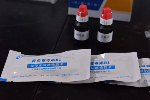 北京智云達技術工程師楊老師和王老師首先將樣品粉碎,通過使用北京智云達自主研發生產的快速檢測產品:黃曲霉毒素B1膠體金檢測卡,對樣品溶液進行檢測。