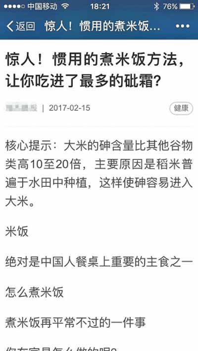 但是,該報(bào)道被國(guó)內(nèi)一些媒體轉(zhuǎn)載后,一些微信公眾號(hào)便借此大做文章,把標(biāo)題改成了“驚人!慣用的煮米飯方法,讓你吃進(jìn)了最多的砒霜?”或者改成“實(shí)驗(yàn)證明,中國(guó)人最常用的煮飯方式,居然砷殘留物最多”。