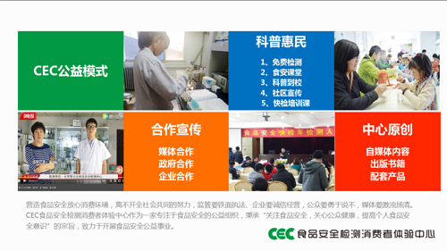 CEC體驗(yàn)中心針對(duì)社會(huì)熱點(diǎn)以及常見食品安全問(wèn)題,與中央電視臺(tái)、英國(guó)BBC、黑龍江電視臺(tái)、北京電視臺(tái)、河北衛(wèi)視等多家電視臺(tái)合作拍攝近百場(chǎng)科普節(jié)目。與法制晚報(bào)、騰訊大燕網(wǎng)合作進(jìn)行直播,從生活中常見的食品安全熱點(diǎn)問(wèn)題出發(fā),對(duì)網(wǎng)上流傳較廣的信息進(jìn)行實(shí)驗(yàn)驗(yàn)證,將謠傳和誤傳擺上實(shí)驗(yàn)臺(tái),用真實(shí)的實(shí)驗(yàn)數(shù)據(jù)粉碎食品安全謠言。此外還參加低碳大篷車科普活動(dòng)以及遠(yuǎn)赴非洲送去水質(zhì)檢測(cè)設(shè)備的公益活動(dòng)。