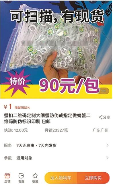 商家所售賣的防偽環(huán)大多都為橢圓形塑料圓環(huán),一面印有陽(yáng)澄湖大閘蟹地理標(biāo)志產(chǎn)品專用標(biāo)志圖案,另一面為二維碼。價(jià)格從一分到五分不等,買得越多越便宜。