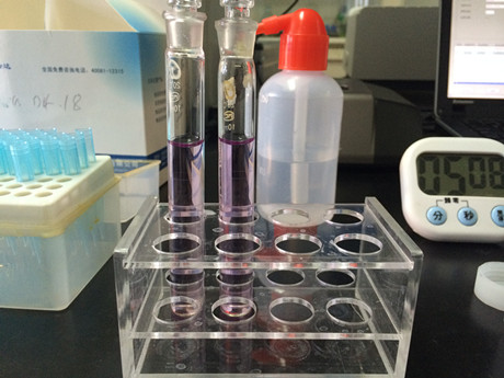 3、取一支10mL比色管,加入1mL樣品液,取一空白管內(nèi)加入蒸餾水替代樣品液,分別加入C溶液80μL,加蒸餾水至10mL刻度線(xiàn),加入D溶液0.5mL,搖勻,開(kāi)蓋靜置10min。